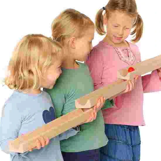 The Erzi team ball track will bring a smile to kids’ faces: the individual players have to form a channel using the 8 pieces of wooden track, while the coloured wooden ball rolls down it. They have to extend the ball track again and again. The aim is to make sure the ball rolls down the track and does not fall off. This requires mutual coordination. To make it harder, you can reduce the number of track pieces.