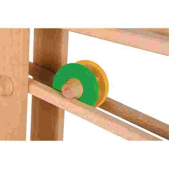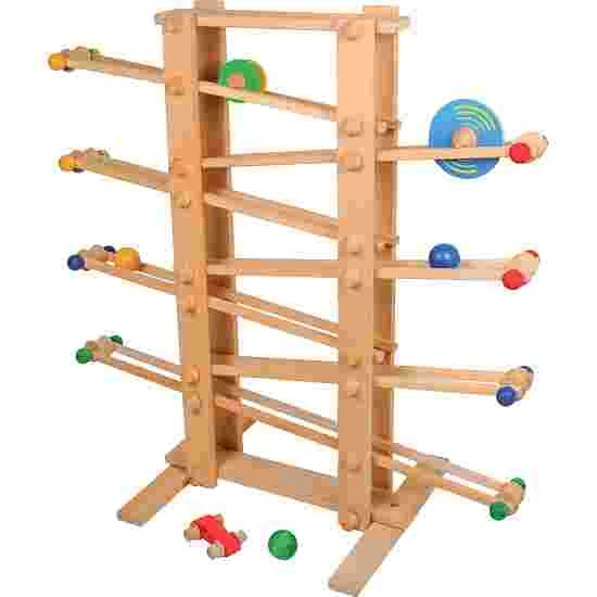 This giant ball run brings movement into play! 3 brightly coloured wooden balls, 1 small car, 1 disc and 1 roller containing a bell inside ring and rattle their way down the various levels. Quick to set up with screw threads. 2 cross braces on the base provide stability. For children aged 3+. Made from worked beechwood. Approx. 70x70x30 cm