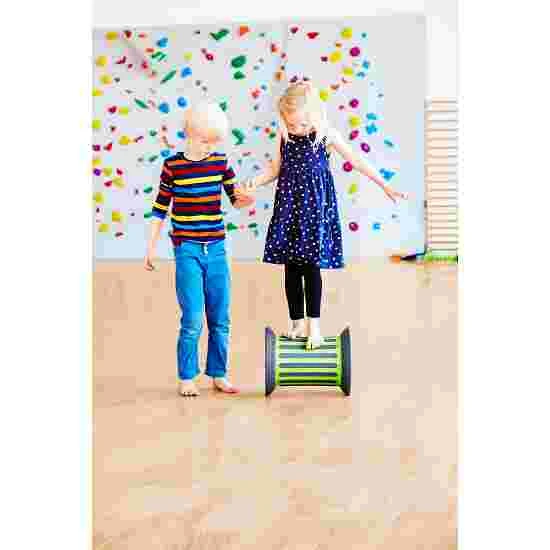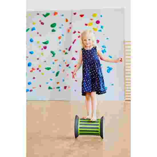 You can’t escape the Gonge roller in its friendly green colour – the balance roller is irresistibly engaging. The rubber stripes on the ends of the balance roller help it grip to the ground securely. Filled with sand to roll slowly. Rubber strips on the tread surface to prevent slip. The strips stimulate the feeling in your feet with every step when walking barefoot on the roller. Smaller children can climb onto the balance trainer with help until they can manage by themselves. Older children test their ability and improve their self assessment.