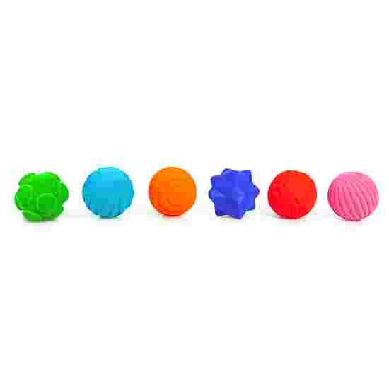 Set of 6 rubber balls in different colours. The various surfaces trigger excellent haptic stimuli. With these balls, throwing, rolling, holding and touching becomes a real experience. For children aged 1–5. Dia. 10 cm. 95 g.