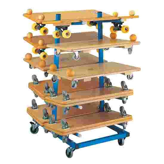 The Sport-Thieme roller board storage trolley is a strong steel tube construction: the trolley has 4 swivel castors and is easy to move, for example from the equipment room to the sports hall. 2 castors are fitted with a brake, preventing the trolley from accidentally rolling away. Up to 20 roller boards can be stored and easily removed from the 10 storage shelves. After use, the roller boards can be just as quickly stored compactly and rolled away.
