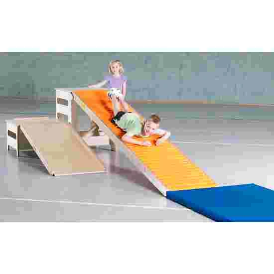 The rolling bar slide set brings variety and fun to children’s sport and therapy. The rolling bar slide is hung to the high platform and can be attached to the special rungs on the front or the holes on the sides. The holes on the sides can also be used as climbing aids. The rolling bar slide is attached to the low platform.