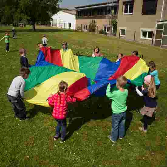 The Sport-Thieme “Standard” parachute can be used in a variety of activities for all ages. The gym parachute is nice and soft. It can be grabbed and held onto by the cloth but of course the attached handles provide a more secure hold during games. The hole in the middle of the parachute allows air to escape, making it easier to move the parachute up and down. A handy pack sack makes for easy transportation and storage.